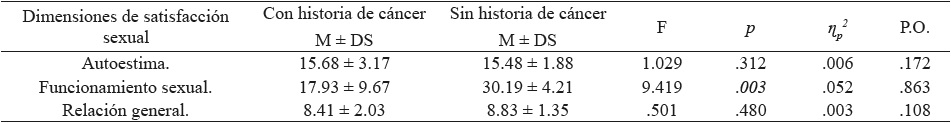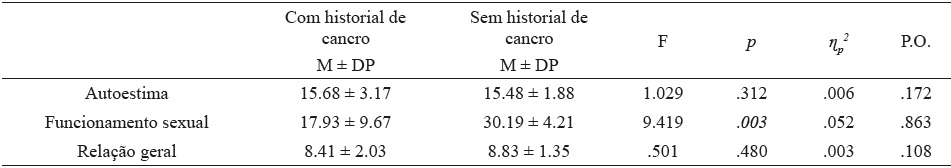 When we compared individuals by history of cancer (Table 1), MANOVA showed a multivariate effect of the non-cancer group and the cancer group for the dependent variable satisfaction with sexual intercourse (F (3,168) = 3.393; p = .019; Wilks λ = .943), with a moderate effect (ηp2 = .057).