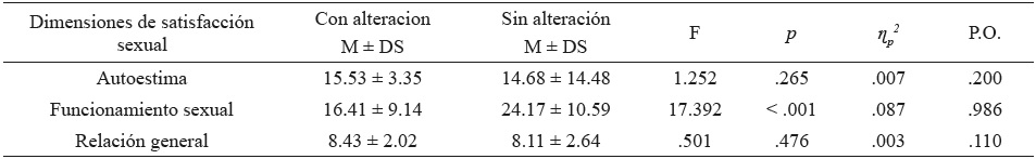We also found a multivariate effect, when we analyzed the relationship between having or not having sexual pro blems and the level of current satisfaction with sexuality (F (3180) = 36,005; p = .001; (Wilks λ = .625), with a very strong effect (np2 =. 375). Statistically significant results were found in sexual functioning (p = .001) with a strong effect (r^2 = .210), with an observed Power (OP) = .995, and those who reported sexual problems showed lower values of sexual functioning (14.59 ± 7.55) than subjects who did not report such problems (25.56 ± 10.26). In the subscales of self-esteem and general relations, no statisti cally significant differences were found.