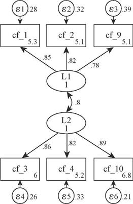 Furthermore, a second factorial solution was generated, this time with two constructs (Table 3, Solution B ), where it was found that these two accounted for 60.1% of the variance, showing a single item test with a community value of less than .50 (CF_5), and factorial weights that differ between the two constructs (with the exception of CF_8 and CF_7); however, alpha values higher than .80 were found in both constructs. A third factorial solution (unpublished) was found, which explained 60.01% of the variance, where the third factor was composed only by item CF_6. Yet, for this reason it was rejected as a factorial option for testing with confirmatory factor analysis. In conclusion, a confirmatory factorial solution was tested with two constructs, starting with 10 test items, with the suspicion that items CF_5, CF_6, CF_7, and CF_8 did not contribute to a solution with sufficient statistical "goodness of fit."