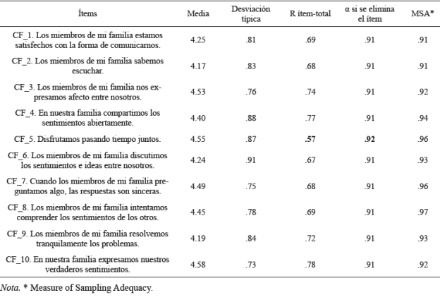 It is an instrument that by its brevity and simplicity allows for individual and group application. It consists of 10 items on a one-dimensional scale that values positive communication skills such as clear and congruent messages, empathy, supportive phrases, and effective problem-solving skills. The application time is approximately 10 minutes. Each item is scored on a scale with five response options: (1) does not describe my family; (2) only slightly describes my family; (3) sometimes describes my family; (4) generally describes my family; (5) describes my family very well.