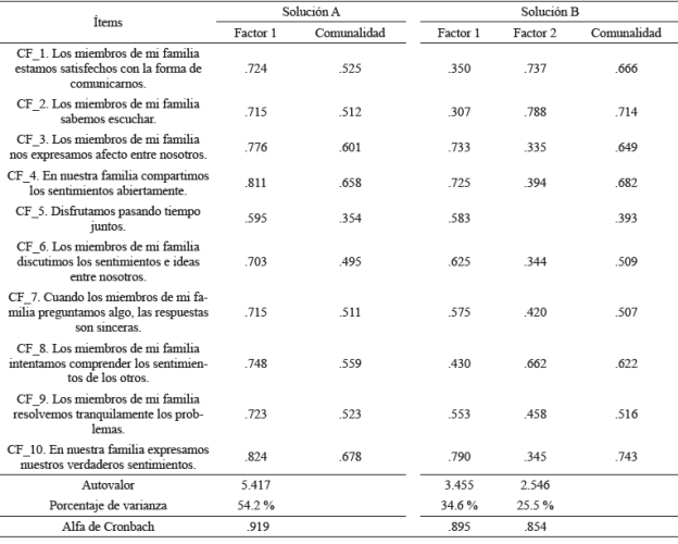 This evidence marks a difference with the original scale, which relies on a one-dimensional solution. In this regard, the results of this research agree with the theoretical assumptions of Banovcinova and Levicka (2015), through which communication is influenced precisely by these two differentiated elements: characteristics of the family (family climate), and the characteristics of the communication process. Indeed, in this adaptation of the instrument, one can see a grouping of those constructs associated with the category of orientation to conversation that stands out from the work of Koerner y Fitzpatrick (2002). In this case, questions were focused on determining the degree to which families create a climate that encourages their members to participate freely in interactions ("members of the family express affection between themselves"), and also of those that point to more general elements of family communication, such as conflict resolution or the ability to listen ("family members know how to listen").