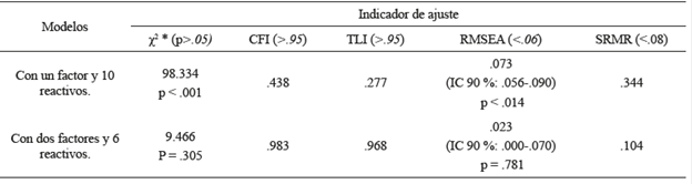 From these two exploratory factor solutions, the statistical fitness of the structural equation models is presented in Table 4. It was found that the factorial solution with two factors and six test items presents the best fit (deleted one-by-one) in comparison with the results based on the unifactorial solution and with two factors and 10 test items.