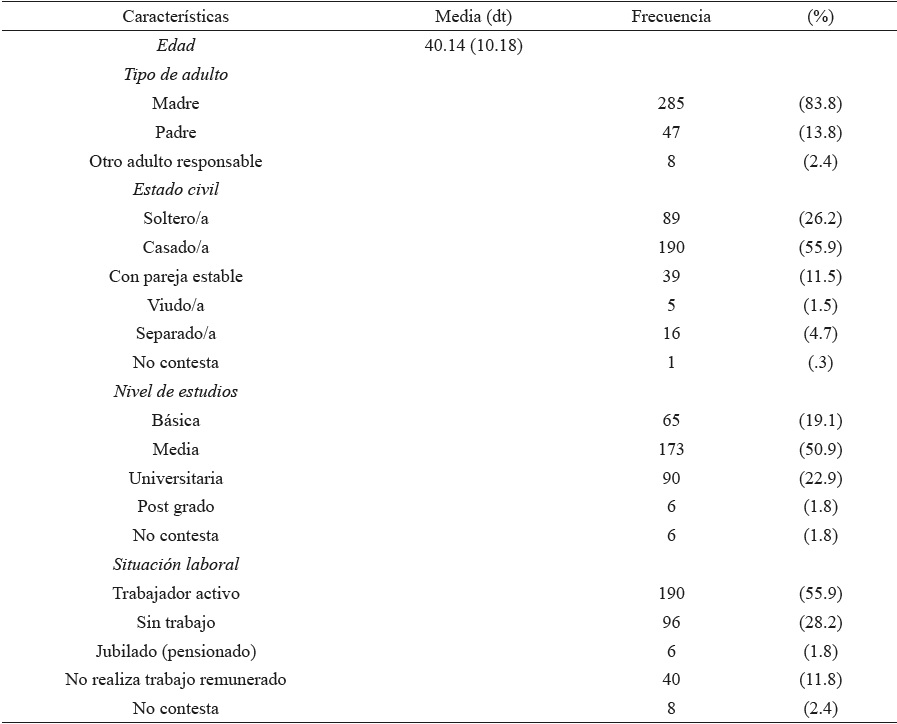 The main descriptive data of the population indicate that the average adult age was 40.14 years (sd = 10.18). Of the total number of participants, 83.8% were mothers, 13.8% were fathers, and 2.4% were other responsible adults. A primary education level was reported for 19.1% of the respondents, while 50.9% had a high school education, and 28.2% had a university or post-university level education.