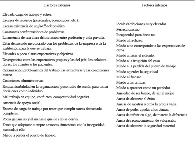 On the other hand, the causes of greater influence in the development of the burnout syndrome lie on the welfare sector, which has been scourged by the current economic crisis, which has increased the poverty threshold, and the enactment of the Law 39/2006, regulating the "Promotion of personal autonomy and care for people in a situation of dependence", which has increased the pressure and saturation of social services (Focal, 2012). In this sense, there are two possible explanations for this phenomenon: whereas some look for the causes within the environment (external factors), others focus their attention on the personality, within the internal disposition of the affected person (See Table 1).