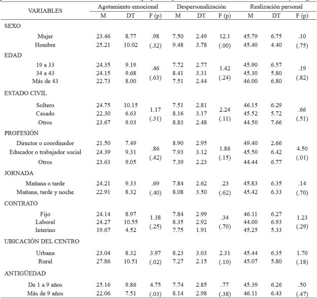 This means that inexperienced staff in juvenile facilities of rural areas has a higher emotional exhaustion index as compared to those operating in urban centres with more than nine years of service. In addition, the results show a higher level of depersonalisation for males than for females and a better self-fulfilment for those people holding managerial positions in the centres.