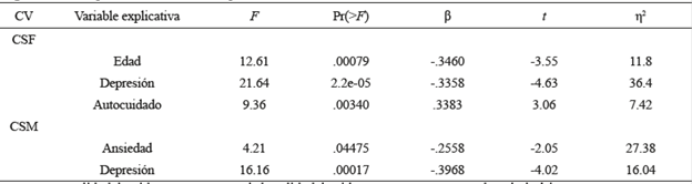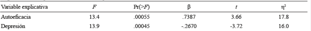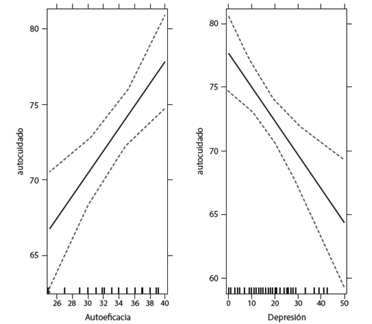 The linear regression analysis (see Table 2) revealed that the minimum significant model explains 33.9% of variance in self-care (F [2, 57]=14.6, p < .05, R2=0.34). The n2 analysis showed that self-efficacy explains 17.8% (β=0.74) and depression explains 16% (β=- 0.27) of total self-care variance; therefore, these variables remain as explanatory variables. Figure 1 shows the relation between both explanatory variables and the response variable.