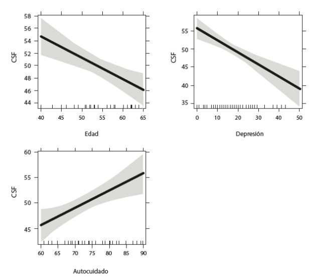 The η2 analysis showed that age explains 11.8%, depression explains 36.4% and self-care explains 7.42% of total variance while every explanatory variable remains unchanged. Figure 2 shows the relationship between the explanatory variables and the response variable.