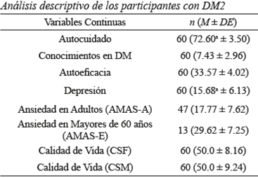 Achieving self-care among population suffering from Type-2 DM is a complex endeavor. Despite the availability of effective treatments, people fail to adequately adhere to such treatments and consequently start to present medical complications which have an impact on their quality of life and lead them closer to premature death (OMS, 2014). Given that the quality of life experienced during chronic diseases is, to a certain extent, determined by effective and sustained personal care, realizing and measuring conditions and factors affecting self-care behaviors is important. To this end, the present study sought to identify sociodemo-graphic and psychological variables related to self-care behavior and quality of life in Mexican adults with Type 2 Diabetes Mellitus