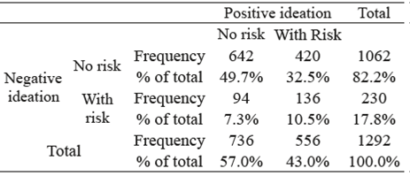 The results presented in table 2 show that of the total of young people who participated in the study, 230 think of suicide as an alternative, that is, 17.8%; but out of this total, 136, corresponding to 10.5% of the sample, do not have protective factors that allow them to cope with adverse situations (see Table 2).