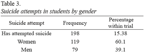 Of the 1287 young people who answered the question "Have you ever tried to commit suicide" 15.38% (198 students) state that they have done so, a fact that is relevant (see Table 3).