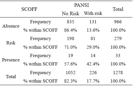 Through the Spearman r coefficient, the correlation bet ween the total of the SCOFF evaluating the eating disorders and the two PANSI scales totals (positive and negative) was established. A low but significant correlation was found between eating disorders and PANSI Negative, the rs score was = .19 with a p = 0.00 value, which indicates that the higher the presence of alarm signals of eating disorders, the more risk factors for suicidal ideation