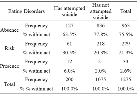 As shown in Table 5, 42.4% of those with symptoms related to eating disorders have a negative suicidal ideation (risk); in addition, 81 students who constitute 29.0% of the youth at risk ofhaving an eating disorder, have negative ideas.