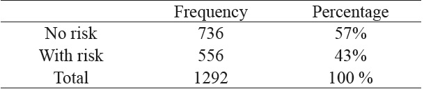 Scores between 2 and 3 were considered a "risk" that indicated the occurrence of some behaviors related to eating disorders, and the denomination "Presence" was assigned to scores between 4 and 5, which indicated the manifesta tion of behaviors characteristic of eating disorders. 2.6% (33 students) of the total sample showed indicators for a possible eating disorder of anorexia and bulimia; 21.6% (279 students) may be at risk for bulimia or anorexia, with the female population scoring higher frequencies.