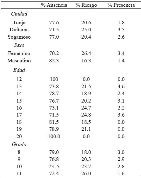 The highest risk and presence of eating disorders is found in the city of Duitama (28.5%), in the female population (28.5%), 17 years' old (28.4%), eleventh grade (27.6%) (See Table 4).