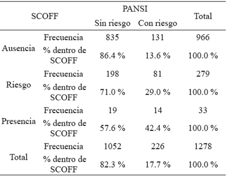 Through the Spearman r coefficient, the correlation bet ween the total of the SCOFF evaluating the eating disorders and the two PANSI scales totals (positive and negative) was established. A low but significant correlation was found between eating disorders and PANSI Negative, the rs score was = .19 with a p = 0.00 value, which indicates that the higher the presence of alarm signals of eating disorders, the more risk factors for suicidal ideation