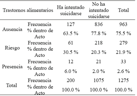 Suicidal intent and suicidal ideation are indistinctly common in women with eating disorders and with depres sion (García-Valencia, et al., 2008; Medina, Piernagorda & Rengifo, 2010). In clinical population, for example, self-injury and its different forms, such as eating disorders, correlate with suicide (Negredo, Melis & Herrero, 2011). The results of this investigation show that, although the population under study was not clinical, a significant as sociation between eating disorders and suicidal ideation and attempt was found too, an indicator that highlights the need to deepen this aspect to prevent suicidal behavior in young people.