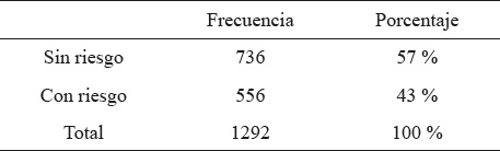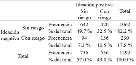 The results presented in table 2 show that of the total of young people who participated in the study, 230 think of suicide as an alternative, that is, 17.8%; but out of this total, 136, corresponding to 10.5% of the sample, do not have protective factors that allow them to cope with adverse situations (see Table 2).