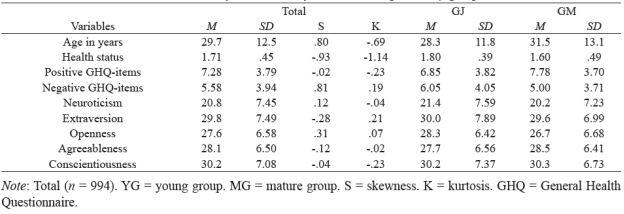 The sample was split into two groups, according to their mean age: young (14 to 25 yrs; M = 19.9, SD = 2.43) and mature (26 to 63 yrs; M = 41.2, SD = 9.42). The young group (YG; n = 541) was formed by 340 women (62.8%) and 201 men (37.2%) and the mature group (MG; n = 453) was formed by 241 women (53.2%) and 212 men (46.8%). Table 1 shows, for descriptive purposes, means, skewness, and kurtosis of the main variables for the total sample and by age group. Skewness and kurtosis of the majority of the variables indicate they fit the normal distribution and suggest that age concentrated slightly in a young age and most answers to the question on health status ("do you have any health problems?") focused on the response "no" (71%), particularly in the YG that shows a mean of 1.80. On the other hand, slight positive skewness is observed for GHQ-negative items, which indicates that the values grouped around low scores.