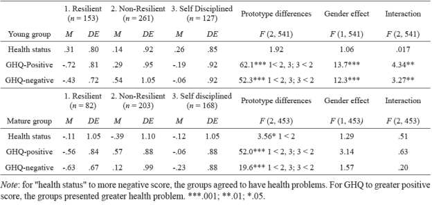 Table 4 also presents the differences by prototypes for the MG. Resilients had the lowest score in GHQ-positive, the greatest number of units or deviations (-0.56) below the mean compared with the Self Disciplined individuals and the Non-Resilient ones. This indicates the Resilients had the best self-rated health, or, if prefered, the lowest perceived distress. In addition, the Self Disciplined individuals also had a greater number of units (-0.06) below the mean than the Non-Resilients, whose units were above the mean (0.57).