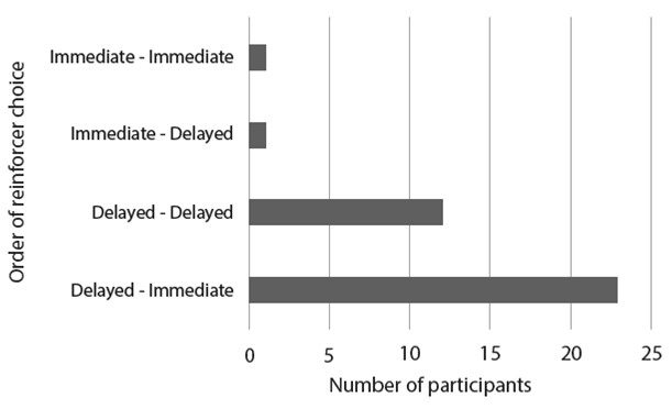 In the same sequence of presentation of the blocks, 13 participants maintained their behavior in the two measurements of self-control; 12 of them behaved according to delayed consequences after each block of trials, and one according to immediate consequences in both measurements.