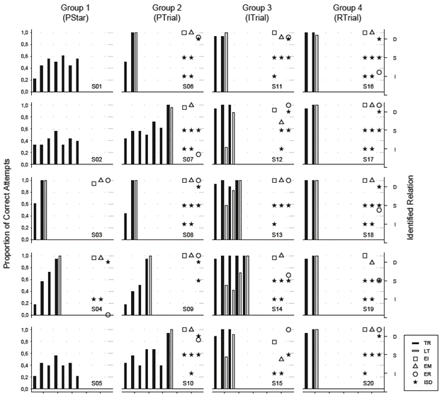 The same finding was evident in Group 4 (RTrial), with the difference that in the extra-relational test the descriptions were mostly accurate, but only two participants had correct attempts proportions higher than .8, which might support the assumption that the establishment of abstract stimulus control does not correspond always with accurate verbal formulation of the contingencies array (Ribes & Rodríguez, 2001), as can be observed as well with participant S03 from Group 1 (PStart), who obtained correct attempt proportions higher than .9 in all transfer tests, but was unable to make accurate or partially accurate descriptions.