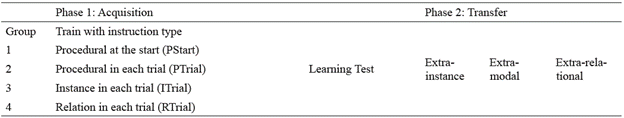 Experimental design. A univariate design with four groups of five participants each was used. Participants were randomly assigned to each group. Group 1 received an instruction with procedural-type content at the start of the experimental task (PStart), while Groups 2, 3 and 4 received instructions with content referring to the procedure (PTrial), instances (ITrial) or relations (RTrial), respectively, in each of the training trials. All groups then were faced with an acquisition phase consisting of training and learning test, and a transfer phase consisting of three tests, each followed by a request to do a written report (see Table 1).