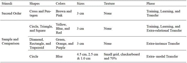 The training phase comprised a minimum of 36 trials or a maximum of 126 trials, divided in blocks of 18 trials consisting of nine identity problems and nine problems of similarity in shape or color. Feedback was provided in each trial when a comparison stimulus was selected, consisting of the words "correct" or "incorrect." Each of the tests consisted of 24 trials: (a) learning test with 12 trials of identity in color and shape, and 12 of similarity in color or shape; (b) extra-instance transfer test with 12 trials of identity in color and shape, and 12 of similarity in color or shape; (c) extra-modal transfer test with 12 trials of identity in texture and size, and 12 of similarity in texture or size; and (d) extra-relational transfer test with 12 trials of difference in color and shape, and 12 of similarity in color or shape. No feedback was provided in any of the test trials, nor were instructions used during training presented. At the end of each transfer test participants were required to write a report on their performance.