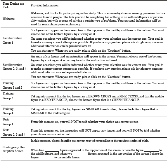 For Group 1 (PStart) the instruction was presented once at the start of the experimental task, before the first training block; for Group 2 (PTrial) the instruction was always the same, and was presented in each of the training trials; for Group 3 (ITrial) instructions varied in each trial according with the presented instances; finally, for Group 4 (RTrial) instructions varied each trial according with the type of relation specified by the second-order stimuli (see Appendix). For those groups where instructions were presented trial-by-trial, the text was presented above the second order stimuli.
