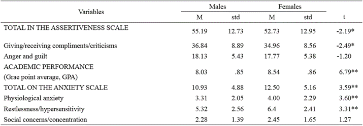 As indicated by the Assertiveness Scale, scores between 51 and 135 points indicate patterns characterized by deficits in social skills and the presence of aggressive behavior. The mean scores obtained by males (M= 55.19, std= 12.73) were higher than those obtained by females (M= 52.73, std= 12.95), and the analysis indicated statistically significant differences (t= -2.19, p <.05). Comparison by sub-scales showed significant differences in factor 1 Giving and receiving compliments and criticisms (t= -2.49, p <.05), which indicates that men show less assertiveness in this aspect, and tend to behave in a way that is more aggressive than women when receiving criticism, expressing their feelings, starting a conversation or making a request. No gender differences were found in relation to factor 2 Anger and guilt, because both males and females reacted predominantly aggressively to situations that bother them.