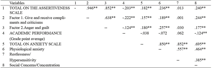 It is also observed that Academic Performance (School Average) correlates negatively with the total of the Assertiveness Scale and with its two factors, although the degree of association is low. Again, considering the interpretation of the scores of this scale, the negative correlations observed imply that young people who behave aggressively have lower academic performance. Regarding the negative correlation observed with one of the subscales of Anxiety, it is interpreted that where there is a lower degree of social concerns or a lower degree of problems with concentration, the students demonstrate higher academic performance.