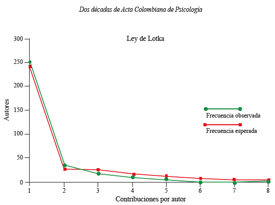 Por otra parte, con respecto al contraste de la Ley de Lotka sobre la productividad científica de los autores que publicaron en Acta, se utilizó en el análisis el modelo de los mínimos cuadrados (Urbizagástegui, 2005); y con el fin de contrastar la producción empírica u observada con la producción teórica o esperada se consideró solamente a los autores principales (primer autor) y se estimó la cantidad de contribuciones, lo que fue sustentado en una primera propuesta teórica (Lotka, 1926).