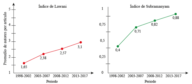 Ahora bien, con respecto a los índices de Lawani y Subramanyam -que miden la colaboración- es posible mencionar que ambos han ido incrementándose en una curva de constante aumento. Específicamente, el índice de Lawani (1981) proporciona el peso promedio del número de autores por artículo. El valor para la revista fue de 2.58, aunque en el último periodo fue de 3.1 y todo indica que dicho valor seguirá aumentando. Por su parte, el índice de Subramanyam (1983) -que estudia el grado de colaboración-refiere que los valores más cercanos a 1 denotan una fuerte proporción de autoría múltiple, y, en este caso, muestra que la proporción de artículos con autoría múltiple para la revista es de .76, aunque, de igual forma, los resultados por quinquenio son de .88 para el último periodo.