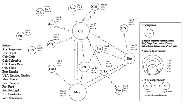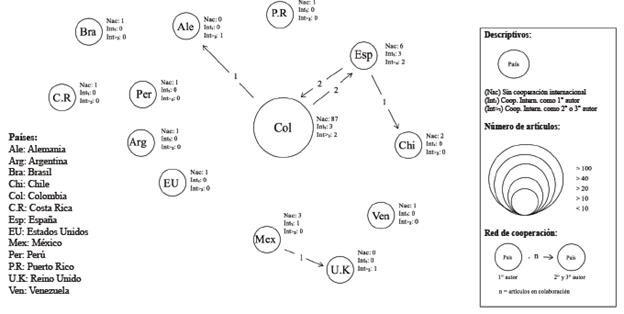 Por otra parte, también se analizó la colaboración entre países, aunque esta variable fue estudiada en el transcurso de una década a otra. En la Figura 3 a se muestran las conexiones para la década de 1998-2007 y, en la Figura 3b, las de la década de 2008-2017. Al hacer un mapeo de las figuras 3 a y 3b, es posible observar con claridad el gran número de diferencias entre estos dos periodos. En la primera década se observan nexos incipientes, donde los primeros trabajos de colaboración se dan entre Colombia y España, entre Colombia y Alemania, y entre España y Chile, para finalmente existir un trabajo de colaboración entre México y Reino Unido. Como se puede visualizar, las relaciones eran escasas y por lo tanto muy fáciles de identificar, pero, en cambio, en la segunda década el cam bio es radical, ya que, si bien en términos de colaboración se mantienen los trabajos realizados entre Colombia y España en primer lugar, la gran cantidad de artículos con al menos alguna afiliación procedente de México ocasiona que este país sea el segundo que desarrolla una importante colaboración con Colombia; aunque también las redes de México se extienden a Cuba, Estados Unidos, España y Brasil. Asimismo, los aportes de México de igual forma despliegan una importante colaboración interna, aunque esta no fue estudiada en detalle debido a la gran cantidad de instituciones participantes.