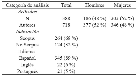 En general, la revista publicó un total de 388 artículos científicos, en donde se encontró un porcentaje mayor de mujeres en la primera autoría (52 %) -sin embargo, al considerar la totalidad de los autores, esta relación se invierte, siendo los hombres quienes presentan dicho por centaje-; asimismo, de la totalidad de los artículos, más de dos tercios se encuentran indexados en Scopus (véase Tabla 1), lo cual indica un factor importante de visibilidad de la revista en el ámbito mundial. De igual forma, cabe resaltar que, si bien los datos muestran un número menor de artículos escritos en inglés, la revista ha realizado el esfuerzo de traducir a dicho idioma todos los artículos que fueron enviados originalmente en español o portugués, lo que demuestra un cambio de fondo en la política editorial que generará mejoras importantes en el impacto y la citación de los artículos (Di Bitteti & Ferreras, 2017), sumado a la percepción de los investigadores de que su investigación será reconocida y recompensada (López-Navarro, Moreno, Quintanilla & Rey-Rocha, 2015).