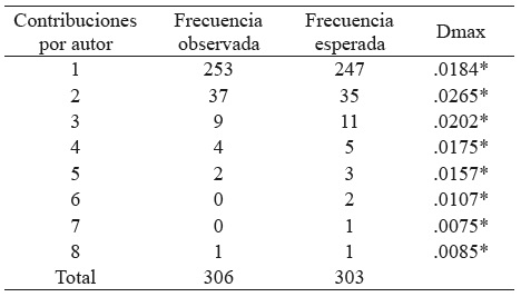 El siguiente paso fue establecer si existen diferencias entre la frecuencia esperada y la frecuencia observada, y, considerando una significancia de .01, se obtuvo un valor crítico (.0828) y se estimó la desviación máxima (Dmax). A modo de interpretación, si el valor crítico es mayor a la Dmax, se acepta que la frecuencia observada se ajusta a la frecuencia esperada; mientras que, si el valor crítico es menor a la Dmax, se rechaza que la frecuencia observada se ajusta a la frecuencia esperada. Como resultado, se ob serva (véase Tabla 2) que el valor crítico es mayor a todos los valores de la Dmax, por lo que se afirma que existe correspondencia entre la producción científica observada y la producción científica esperada en Acta, y que, de esta forma, se cumple la Ley de Lotka (véase Figura 1). Con respecto a estos datos, es importante aclarar que, por políticas de la revista, en un mismo año solo es posible la publicación de un único artículo por autor.