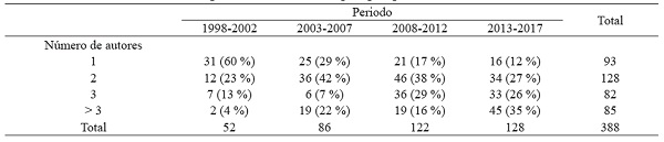 En la Tabla 3 se muestra el número de autores, distri buidos según el número de autores por quinquenio. La primera evidencia detectada es que los trabajos con un solo autor han disminuido desde el primer al último quinquenio, pasando de un 60 % de trabajos realizados por un autor a tan solo 12 % en el último periodo, lo cual sugiere que la colaboración se ha convertido en un aspecto indispensable en la época actual.