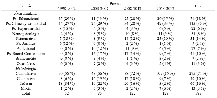 Las temáticas y metodologías de investigación se encuentran analizadas en términos de la frecuencia y por centaje en cada uno en los cuatro quinquenios incluidos. En términos de resultados generales, tal como se declaró en el estudio previo de Ravelo et al. (2016), el área de psicología clínica y de la salud presenta la mayor cantidad de trabajos, seguida por la de psicología educacional, la de psicometría y la de psicología social-comunitaria. Por su parte, la misma situación ocurre con la predominancia de trabajos realizados con metodología cuantitativa (Ravelo et al., 2016), la cual supera ampliamente a los trabajos teóricos y de metodologías cualitativas -los trabajos que incluyen metodologías mixtas son escasos en la trayectoria de la revista-. Adicionalmente, como se puede apreciar (véase Tabla 4), es importante mencionar que, en el último quin quenio, justamente los trabajos en psicología clínica y de la salud y las metodologías cuantitativas también superaron el valor general, lo que demuestra que dichas tendencias no solo son históricas, sino también actuales.