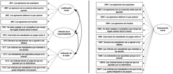 Como resultado de estos dos tipos de consideraciones, en la DMEA se miden los mecanismos de: (a) la justificación moral, que implica evaluar un comportamiento dañino como útil y socialmente digno (De Caroli & Sagone, 2014; Thornberg & Jungert, 2014); (b) la difusión de la responsabilidad, que involucra diluir la culpa por la conducta no moral en el grupo (Bandura, Underwood & Fromson, 1975; Caravita et al., 2014) y (c) la atribución de culpa, donde se considera que la conducta agresiva es provocada por la víctima (Newton et al., 2016; Pozzoli et al., 2012). Finalmente, en este estudio se analiza la validez de contenido de la escala mediante el juicio de expertos, y, posteriormente, se realiza una comparación de un modelo de tres dimensiones con un modelo alternativo unidimensional (véase Figura 1) para indagar en la validez de la estructura interna y se evalúa la invarianza de medida para ambos sexos de la escala. Y, por último, se analizan las evidencias de validez concurrente mediante la relación de los puntajes de la escala con la empatía y compasión; esto debido a que la evidencia disponible sugiere que la desconexión moral se relaciona de forma negativa con ambas emociones morales (Barriga, Sullivan-Cosetti & Gibbs, 2009; Thornberg et al., 2015).