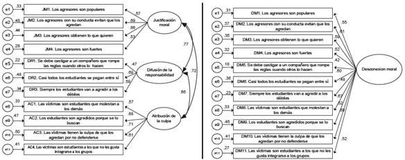 Por otra parte, con respecto a la escala, se aprecia que el modelo de medición multidimensional se ajusta mejor a los datos que el modelo unidimensional, lo cual sugiere que la desconexión moral implica la utilización de mecanismos que, aunque relacionados, miden aspectos diferentes del constructo (Bandura et al., 1996; Newton et al., 2016; Paciello et al., 2008). Teóricamente, esto implica que es necesario analizar los factores asociados y los efectos en la conducta de cada uno de estos mecanismos, y, en el aspecto práctico, muestra la necesidad de diseñar intervenciones específicas dirigidas a desestimular el uso de las diversas formas de desconexión moral.