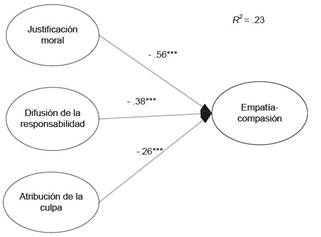 Para indagar sobre la validez concurrente de la DMAE se analizaron, mediante una prueba de regresión múltiple, los efectos de los mecanismos de desconexión moral en las emociones morales de empatía-compasión. De los resultados, se infiere que los mecanismos de desconexión moral (justificación moral, difusión de la responsabilidad y atribución de la culpa) se relacionan de forma negativa con las emociones morales de empatía-compasión (véase Figura 3).