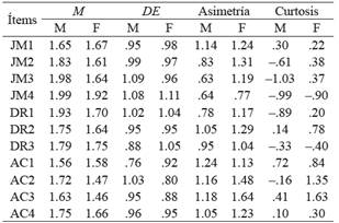 En la Tabla 1 se muestra que los estudiantes utilizan con escasa frecuencia los mecanismos de desconexión moral. Los valores de asimetría y curtosis sugieren la existencia de normalidad univariada en la distribución de los puntajes de los ítems.