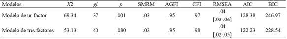 Se utilizaron los índices de ajuste X2 (Chi-cuadrada), SRMR (raíz cuadrada de residual estandarizada), AGFI (índice de bondad de ajuste ajustado), CFI (índice de ajuste comparativo) y RMSEA IC 90 (error de la raíz cuadrada de la media de aproximación con su intervalo de confianza), donde se consideraron como aceptables los valores de X2 con p > .001; CFI y AGFI ≥ .95; y SRMR y RMSEA ≤ .05(Blunch, 2013; Byrne, 2010). Para comparar el ajuste de los modelos, se emplearon el AIC (criterio de información de Akaike) y el BIC (criterio de información Bayesiano). En ambos casos se considera que valores menores indican mejor ajuste (Kline, 2016; Wang & Wang, 2012).