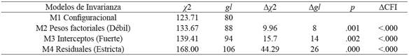 Para el análisis de la invariancia en la medición en ambos sexos se compararon cuatro modelos anidados: (a) M1, sin restricciones (invariancia configuracional); (b) M2, con restricciones referidas a la igualdad de pesos factoriales (invariancia métrica); (c) M3, con restricciones relativas a las cargas factoriales e interceptos (invarianza escalar); y (d) M4, con restricciones en lo relativo a la equivalencia entre cargas factoriales, interceptos, varianzas y covarianzas residuales (invarianza estricta).