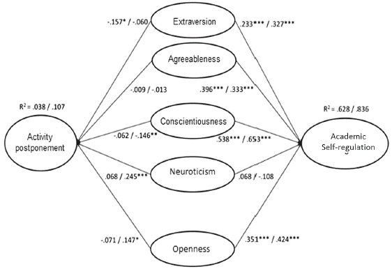 Abstract: The objective of the present study was to analyze whether there are differences between men and women in terms of the influence of personality dimensions on academic procrastination. Participants were 986 students aged between 16 and 40 years (69.8 % women, Mage = 20.81 years), students of different professional careers from two universities located in Lima. The Academic Procrastination Scale (APS) and the Big Five Inventory-15P (BFI-15P) were the instruments administered. An invariance analysis of a structural regression model that indicates the influence of personality on academic procrastination was implemented. The results show that personality explains a significant percentage of the variability of the dimensions of academic procrastination. However, the influence of two dimensions, consciousness and neuroticism, is greater in women. The theoretical and practical implications of the findings are discussed, as well as the need to strengthen curricular plans aimed at enhancing resources and reducing those aspects that could negatively affect the academic behavior of the student.