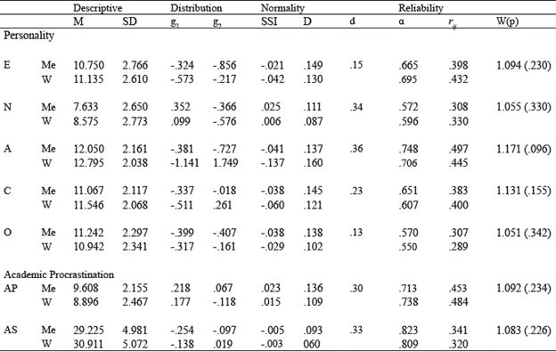 Findings from basic descriptive aspects to invariance analysis of personality influence on academic procrastination according to gender are presented below.
