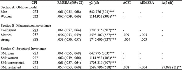 Previous analysis of measurement invariance indicates that the adjustment of the oblique model was acceptable in men and women separately (See section A, Table 2), that correlation among factors was moderate and construct reliability was acceptable for all variables (See Table 3), which allows for the analysis of measurement invariance. In this sense, once this procedure is carried out, variations in CFI and RMSEA indicate compliance of the metric, strong and configural invariance (See section B, Table 2).