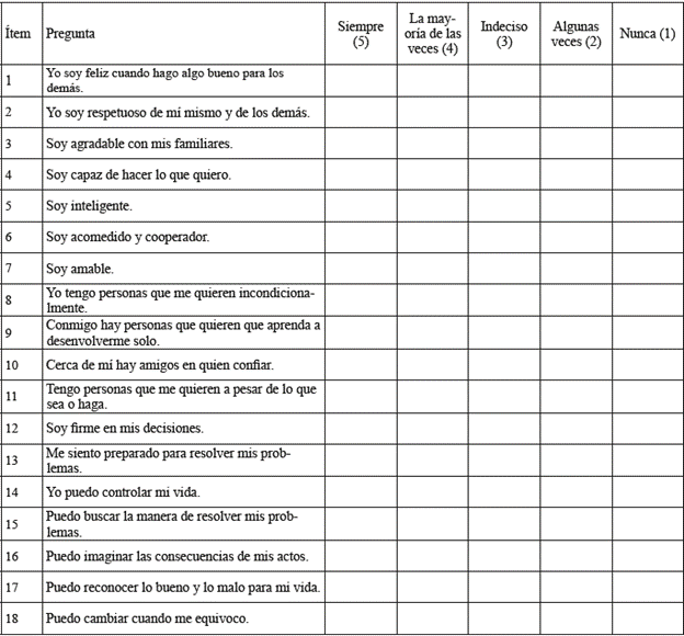 The "Escala de Resiliencia para Adolescentes", was developed from the adaptation of the "The Resilience Scale for Adolescents" (READ, Hjemdal, Friborg, Stiles, Martinussen & Rosenvinge, 2006). The adaptation to Mexican population was carried out in adolescents between 12 and 17 years old, using the Principal Components method, finding a five dimensions structure with 22 items. Four of the original factors were preserved: family cohesion (α = .82), social competence (α = .73), personal competence (α = .64) and social resources (α = .70), while the fifth dimension, structured style, was eliminated. In the validation process, the authors added a factor called goal orientation (α = .60, Ruvalcaba-Romero et al., 2014).
