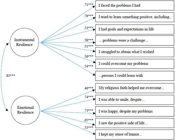 The original dimensions of the RESI, Coping, Perseverance, Self-efficacy and Goal Orientation con tain items grouped in the Instrumental Resilience factor. The dimensions Positive Attitude, Sense of humor and Religiousness contain items grouped specifically in the Emotional Resilience factor, except for the items "I try to learn something positive, including the problems I face" and "I try to be with persons where I can learn something positive", which were more clearly explained with the Instrumental Resilience factor.