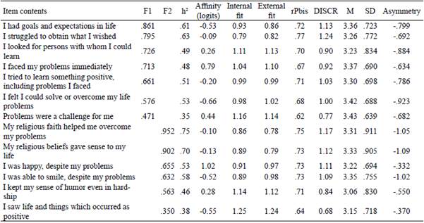 To complete the review of the psychometric properties of the set of items composing the solution of two factors, Rasch analysis was applied once again for the items of each factor and the results appear in Table 1. The affinity values show a wide range of the set of items to capture the attribute, within which, the item "I was happy despite my problems" assumes a greater sensitivity in relation to the Emotional resilience with respect to the rest of the items of this factor, since the 1.02 value represents at least a one logit difference compared to the other items composing the scale. As the main result of this analysis, it was found that all the items show satisfactory internal and external fit values (.5 to 1.5) for perception scales and that the biserial point correlation coefficient in each one is either acceptable or moderate. Furthermore, the empirical discrimination of the two items is indicated, describing the strength with which they distinguish the people who really have the attribute; where 1 is the expected value, the levels of most of the items are good and a couple of cases are considered acceptable.
