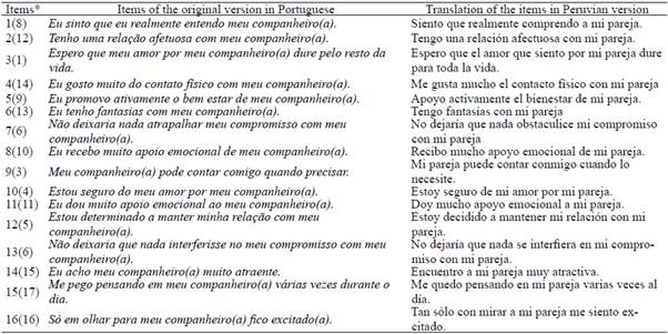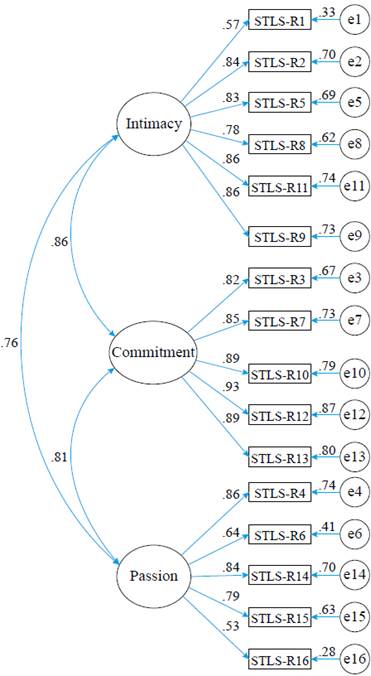 The values for omega coefficient (ω) were above .85 for the three factors: intimacy (ω = .91), commitment (ω = .93) and passion (ω = .86).